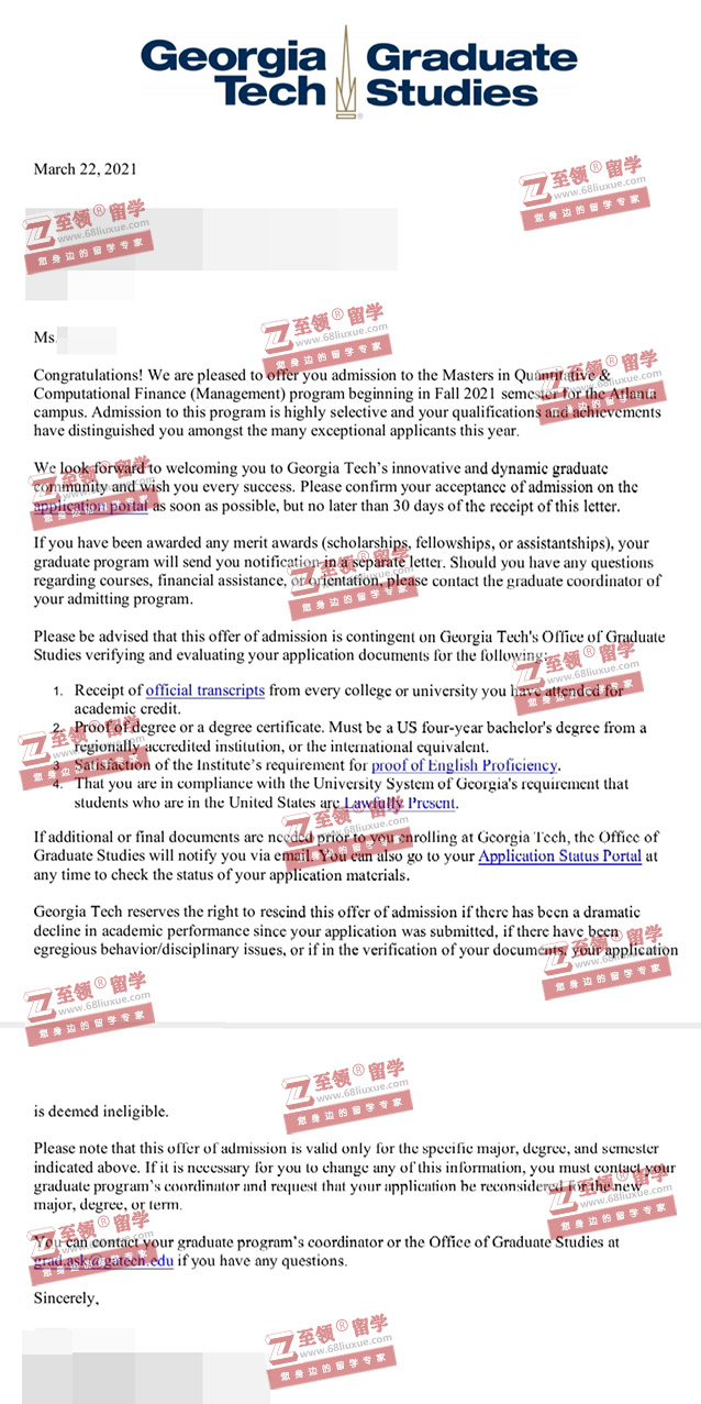 录取结果:GIT,MS in Quantitative and Computational Finance佐治亚理工学院定量与计算金融硕士录取