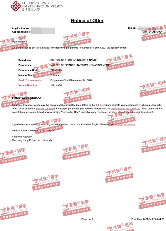 录取结果:The Hong Kong Polytechnic University ,Master of Finance (Investment Management)香港理工大学金融硕士(投资管理)录取