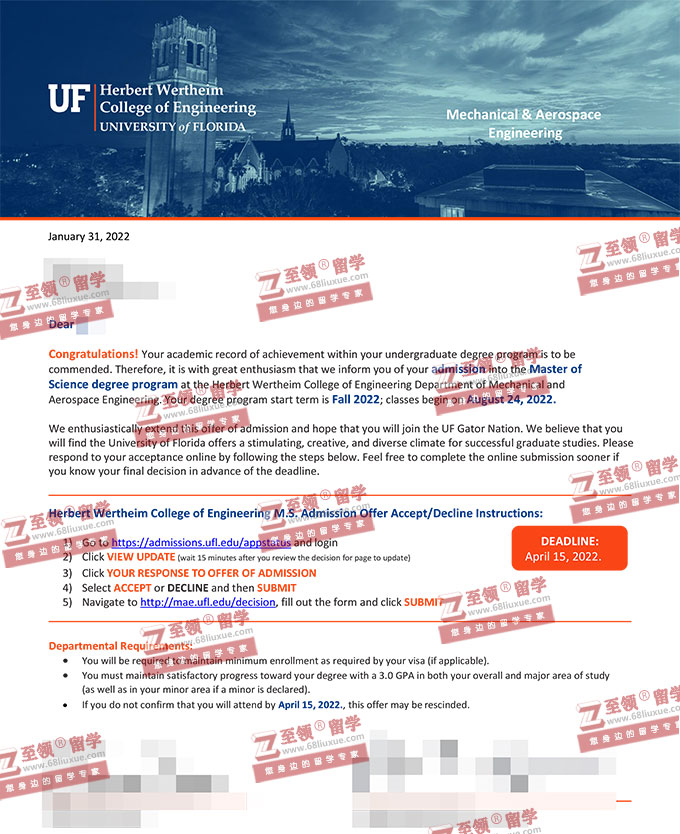 录取结果:university of florida,master of science in mechanical engineering佛罗里达大学机械工程硕士录取