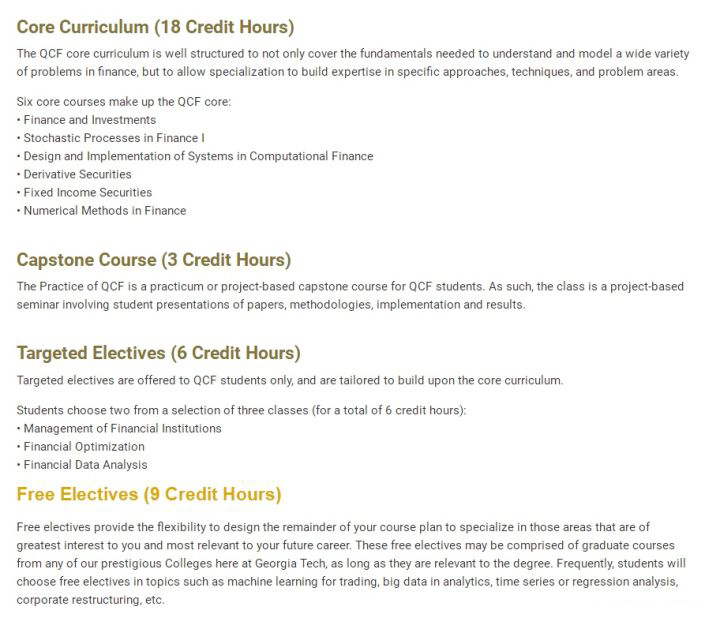 The Master of Science degree program in Quantitative and Computational Finance (QCF) 项目于由Georgia Tech.三个知名学院,也即是School of Industrial and Systems Engineering, School of Mathematics和College of Business共同提供,共三个学期,学生将学习实用的定量分析方法、编程方法和金融理论知识。正常学制为1.5年 。The QCF program在春季和秋季都有招生,开学日期分别在1月和8月,而申请结果通常在提交申请后4-8周出结果。