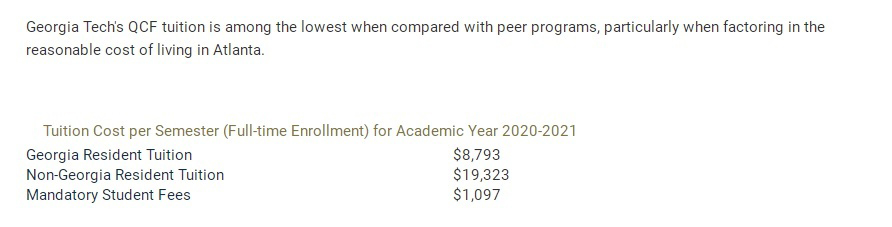 Georgia Tech的 QCF项目在同等级名校同类课程中,学费几乎是最低的,学校充分考虑到了学生在亚特兰大合理的生活成本。