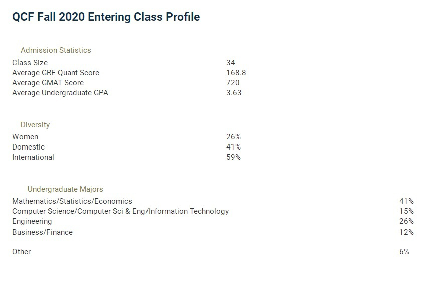 The QCF program 的候选人必须具备良好的本科定量学术经历背景。 通过成绩单, 申请人必须能展示以下方面的知识: calculus, including differential and integral calculus of one variable and multivariate calculus, fundamentals of linear algebra and linear systems of equations, differential equations, and probability and statistics.
