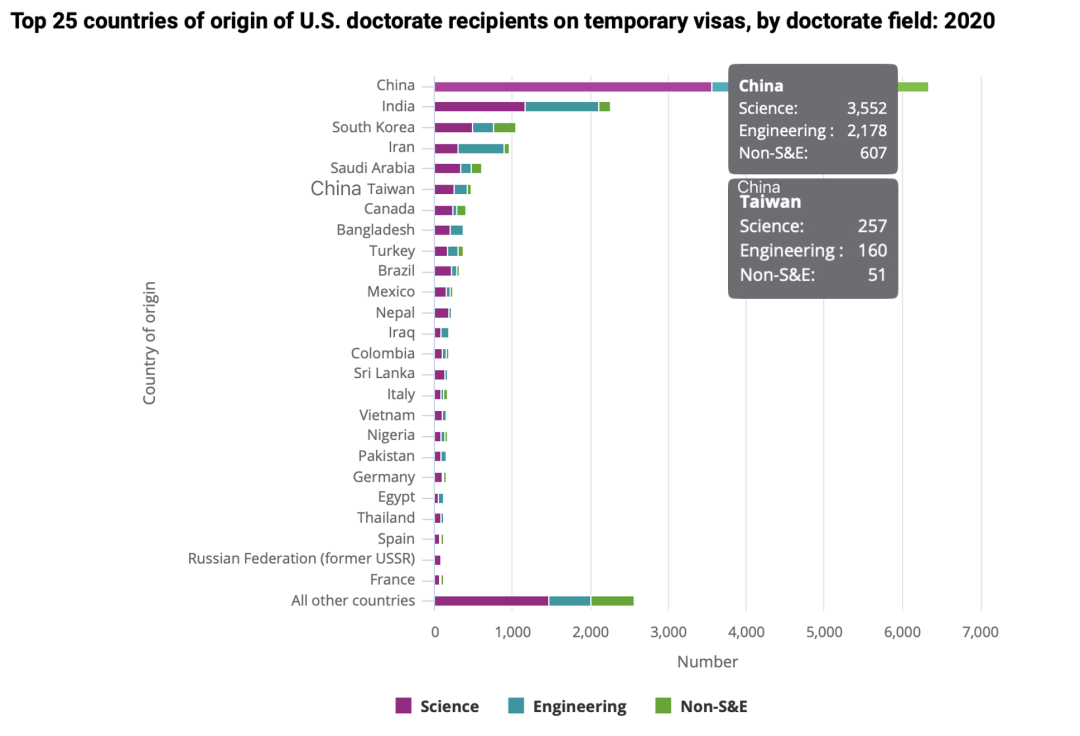 来自前25个国家的博士学位获得者占所有获得博士学位的国际生的86%。排名前三的国家中国、印度和韩国占了一半以上。而中国人是最多的,占国际生总数的三分之一。