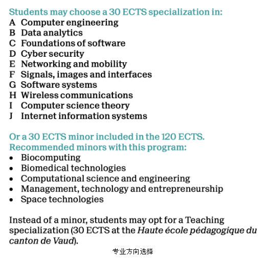 计算机工程,数据分析,软件原理,网络安全,网络与移动,信号图像与接口,软件系统,无线通信,计算机理论,互联网信息系统。每个课程对应若干个专业方向,每个同学需要在选定的方向中修满至少30学分,或者在辅修学历中修满至少30学分。总体而言,在大部分领域EPFL提供的课程都是比较全面的,相对课程较少的方向包括人机交互等。