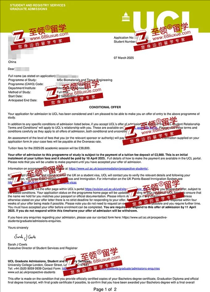录取结果:伦敦大学学院生物材料与组织工程硕士录取