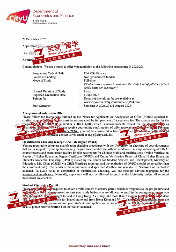 文书材料中强调实习期间参与的信贷风险评估项目,结合Python数据分析工具的应用,通过实习案例展现对金融风险的实操理解,体现“理论+实践”能力。为了获得最好的录取结果,申请团队为H同学做了梯度选校,将香港大学、香港科技大学、香港中文大学、香港城市大学全部囊括在内。凭借扎实的学术基础和丰富的实践经历,H同学成功获得香港城市大学金融学硕士(MSc Finance)录取。