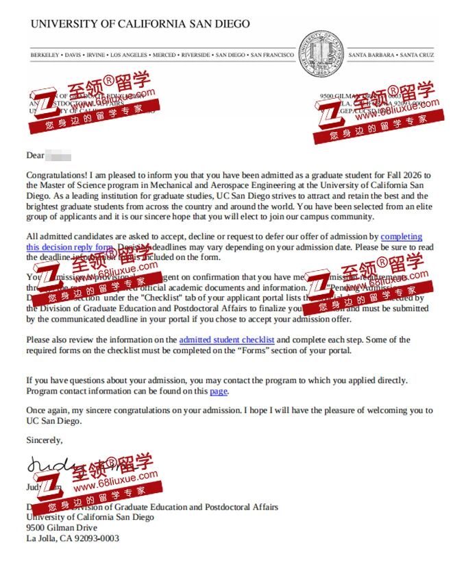 Y同学,海外本科机械工程专业,GPA3.5,在至领留学帮助下成功斩获加州大学圣地亚哥分校(UCSD)机械与航空工程硕士OFFER。