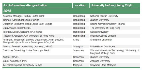 城市大学的一大特色是地理优势,位处九龙塘商业区,学生在最接近商业中心的地方学习经济学,能够最直观的感受商业氛围,融入这个环境,更紧密的将理论结合实际。此外我们前面谈到,应用经济学专业以实用性见长,许多老师有丰富的实践经验。在未来的择业选择上,多以应用型为主,我们从2014年应用经济学硕士专业的学生就业去向可见一斑,就业去向覆盖了银行、审计、证券、会计等。