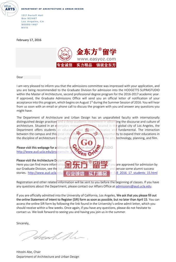录取结果:加利福尼亚大学洛杉矶分校建筑学专业硕士