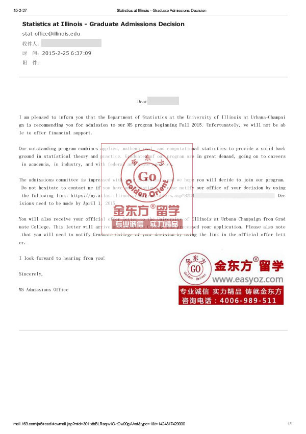 录取结果:伊利诺伊大学香槟分校,统计学硕士