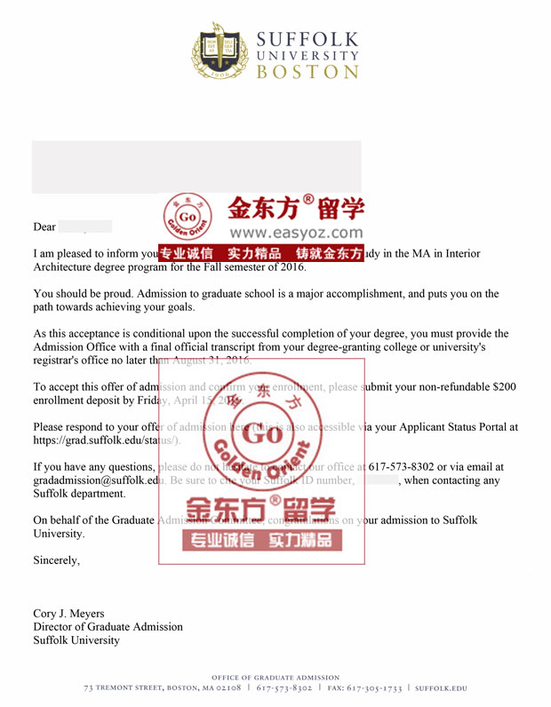 2、3月份是美国大学发offer的高峰期,幸运的是我们就欣喜的收到了萨福克大学发来的offer,这是很令人欣慰的一件事情,萨福克大学在建筑类院校里排名还可以,也是学生一直梦寐以求的大学。学生说很感谢金东方留学服务团队的老师帮助自己申请到了自己理想的大学,尤其感谢文书老师在文书和申校过程中的指导和帮助。能够帮助学生申请到自己理想的学校,我们也很欣慰,希望S同学在美国的大洋彼岸,学有所成~