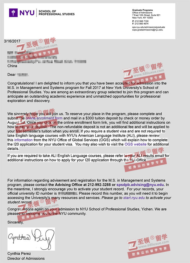 录取结果:New York University(纽约大学),M.S. in Management and Systems (管理与系统硕士)