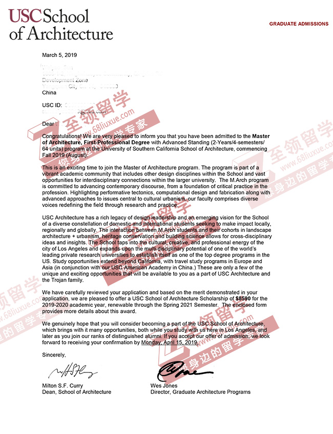 录取结果:USC,Master of Architecture南加州大学建筑学硕士,奖学金 $8590