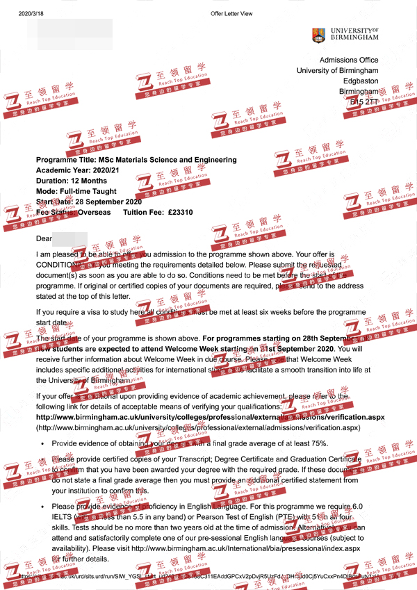 录取结果:University of Birmingham,MS Materials Science and Engineering伯明翰大学材料工程硕士录取