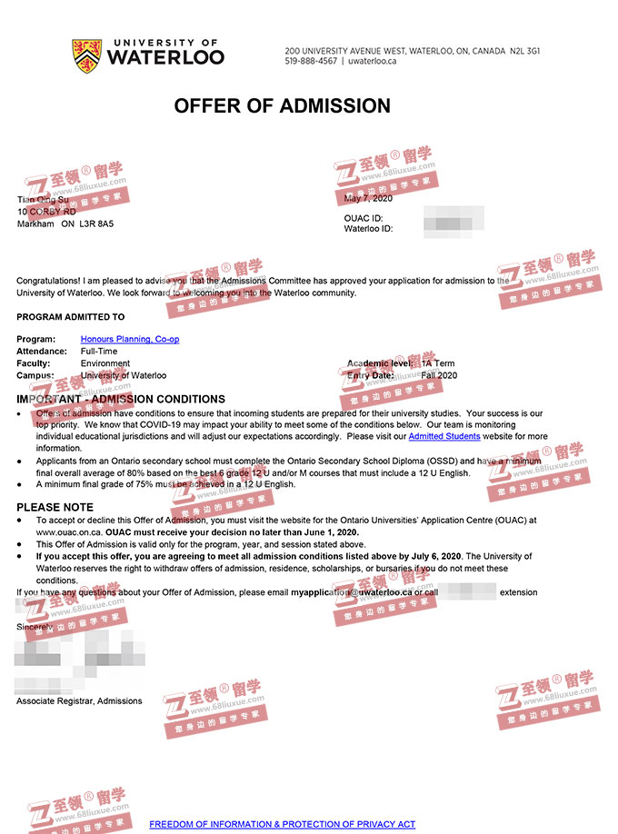 录取结果:University of Waterloo ,Bachelor of Honours Arts, COOP滑铁卢大学文学学士录取