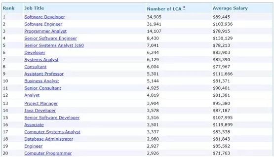 同时,从全美排名前20的H-1B职位来看,平均年薪中位数超过10万美金的岗位多集中于计算机、软件开发、电商、信息服务和金融投资。