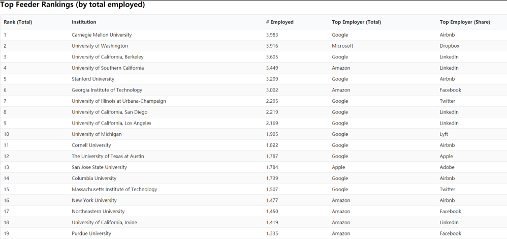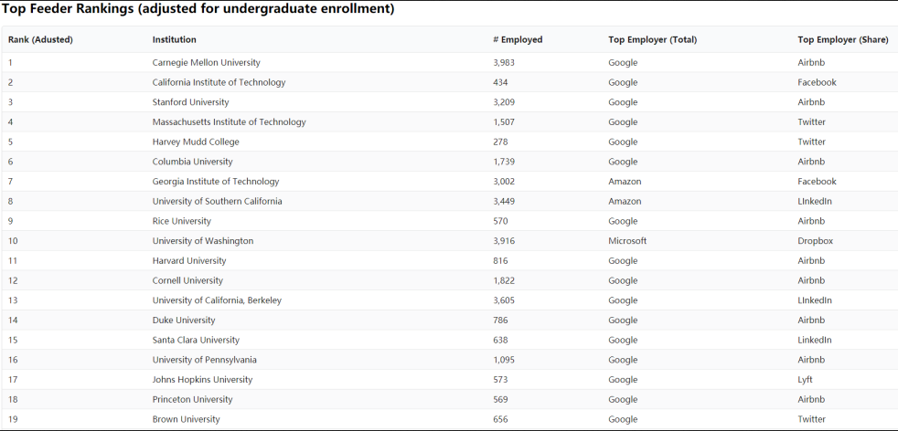 以在这两份榜单中都位列第一的卡内基梅隆大学为例,该校共有3983名毕业生取得了这11家科技巨头公司的岗位,其中谷歌是最大的雇主公司;但是爱彼迎虽然在数量上少于谷歌,但是占比却是第一的。