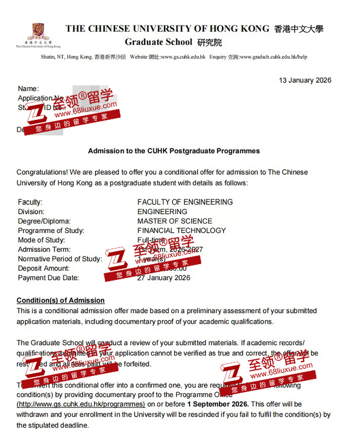 经过至领留学团队与R同学默契配合,学生成功获得香港中文大学金融科技硕士的录取。