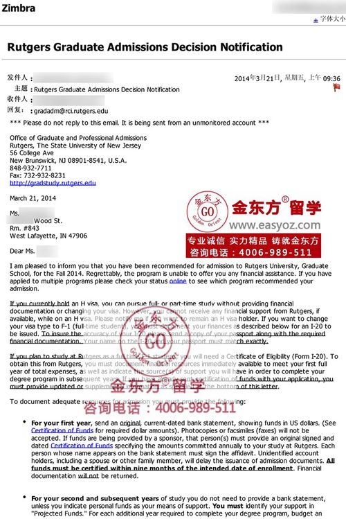 能申请到美国罗格斯大学,主要还是因为她在本科期间的优秀经历。她去澳大利亚做过半年的交换生,还去南非参加过暑期夏令。金东方留学团队根据她的这些经历编写了一份非常优秀的文书,着重讲她做交换生的这短时间的表现,突出C同学的独立个性。还有在校期间做过一些地理科学方面的研究,文书中的个人陈述写的比较贴近这个专业的特点,明确表明她对环境科学专业专业的透彻的理解和研究,因此被成功录取。