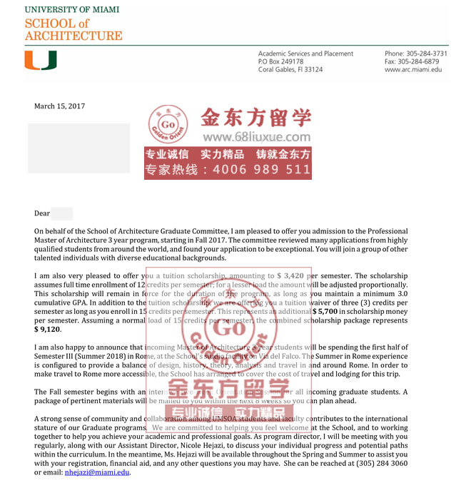 录取结果:University of Miami迈阿密大学, Master of Architecture 建筑学硕士,奖学金每学期$ 9,120